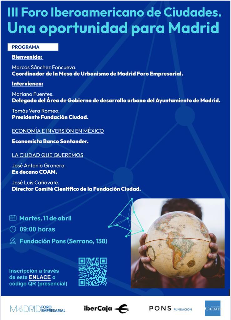 Madrid Foro Empresarial organiza una presentación del Foro Iberoamericano de Ciudades a empresarios de sectores implicados en el desarrollo de las ciudades el próximo 11 de abril a las 09:00 horas en la sede de la Fundación Pons, calle Serrano 138 de Madrid.